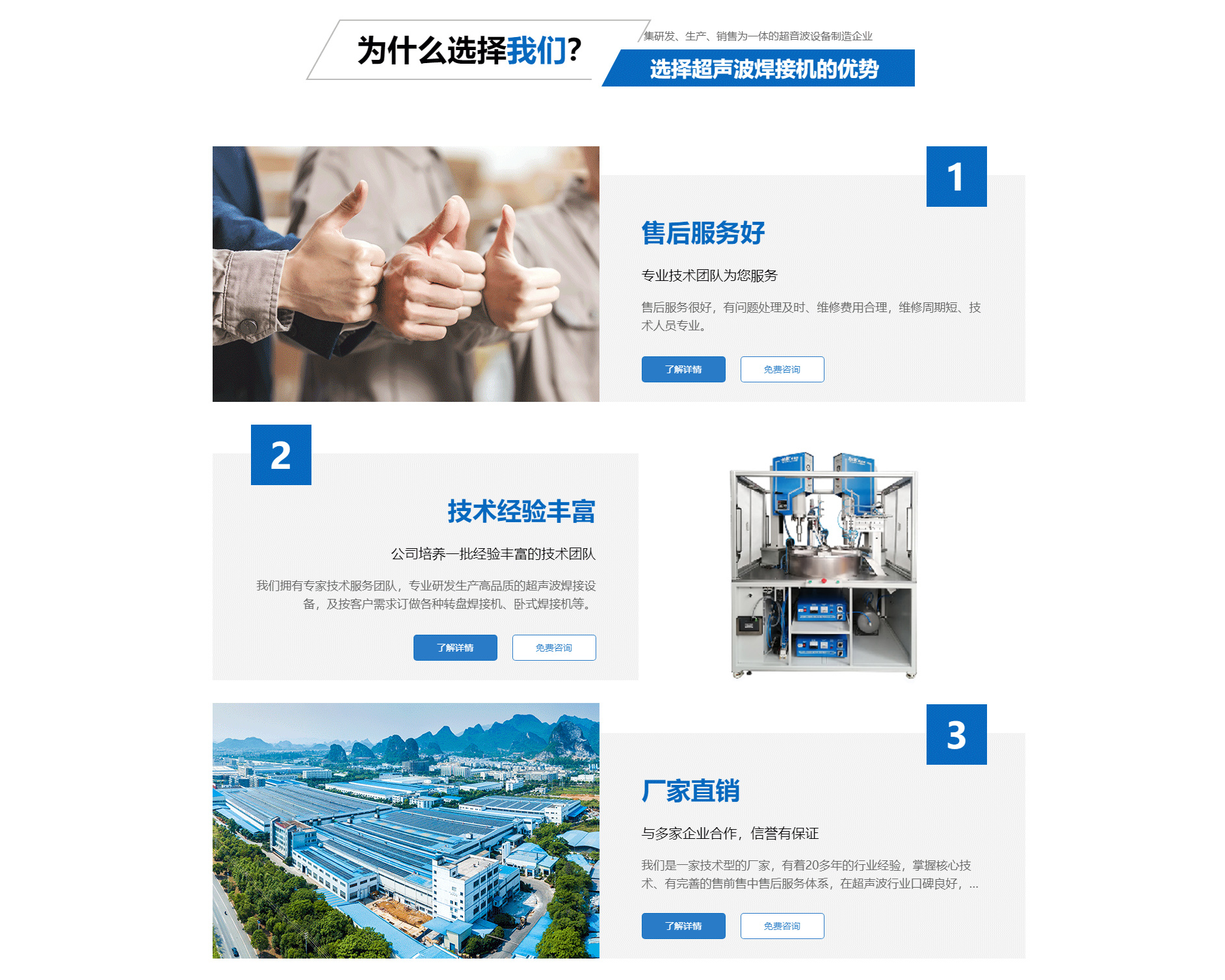 關(guān)于我們廈門(mén)勁榮機(jī)械設(shè)備有限公司是一家集研發(fā)、生產(chǎn)、銷(xiāo)售為一體的超音波設(shè)備制造企業(yè),主要產(chǎn)品包括多規(guī)格型號(hào)的超音波塑膠熔接機(jī)、熱板式塑料焊接機(jī)、多工位轉(zhuǎn)盤(pán)焊接機(jī)、振動(dòng)摩擦焊接機(jī)、旋轉(zhuǎn)式塑膠熔接機(jī)及配套的工裝夾具等。公司自2003年成立以來(lái),一直致力于產(chǎn)品不斷完善中,并追求產(chǎn)品的精益求精,于2004年向國(guó)家商標(biāo)局注冊(cè)了“勁榮”牌商標(biāo),2009年榮獲廈門(mén)市商標(biāo)。 經(jīng)過(guò)多年的努力,公司已經(jīng)發(fā)展成為占地面積2000余平方米、擁有員工50余人的企業(yè)。公司一直將“品質(zhì)是企業(yè)發(fā)展的原動(dòng)力”作為經(jīng)營(yíng)理念,嚴(yán)把質(zhì)量關(guān),建立了一整套有效的安全生產(chǎn)及管理模式,不僅贏得了同行的認(rèn)可,更取得了客戶的信賴(lài),先后與九牧集團(tuán)、路達(dá)工業(yè)、建霖集團(tuán)、西伯電子、蒙發(fā)利實(shí)業(yè)、松霖科技、銥科集團(tuán)、科司特電子等公司建立了長(zhǎng)期的合作關(guān)系。 面對(duì)已經(jīng)取得的成績(jī),我們不驕不滿,因?yàn)樯钪獦I(yè)績(jī)只能代表過(guò)去,只有靠良好的產(chǎn)品質(zhì)量和完善的售后服務(wù)才能在客戶中口碑相傳,在...